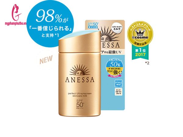 - Kem chống nắng Anessa Perfect UV suncreen skincare milk: Đây là kem chống nắng cao cấp được yêu thích không chỉ ở Nhật mà còn ở các nước trên thế giới. Khả năng chống nắng vô cùng hiệu quả. Dạng sữa lỏng nên thấm vô cùng nhanh, lớp sữa rất mỏng nên bạn sẽ không cảm thấy nặng mặt hay bí bách khó chịu khi sử dụng.