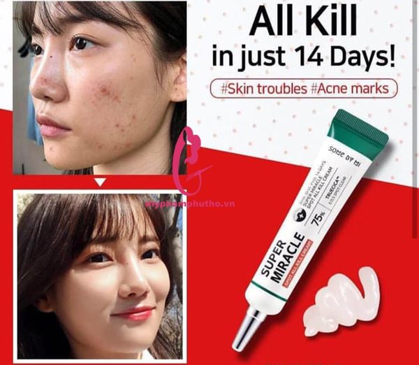 - Chị Mai Thuỷ - Bắc Ninh : Kem trị mụn SOME BY MI AHA-BHA-PHA 14 Days Super Miracle Spot có thiết kế dạng tuýp nhựa rất nhỏ gọn với dung tích 30ml và có hai màu đặc trưng của thương hiệu Some By Mi là màu trắng và xanh lá vô cùng xinh xắn. Kem điều trị mụn SOME BY MI AHA-BHA-PHA 14 Days Super Miracle Spot có kết cấu dạng gel màu trắng đục, khi thoa lên da thấm rất nhanh mà không hề bị bết dính hay khó chịu. Về mùi hương thì em này cũng không quá gắt, rất nhẹ nhàng và dễ chịu, thơm mùi tràm trà và rau má, là mùi của hai thành phần nổi bật có trong tuýp kem. Trị Mụn Some By Mi AHA-BHA-PHA 14 Days Super Miracle Spot All Kill Cream có một ưu điểm nổi bật hơn hẳn so với những dòng trị mụn khác đó là không gây khô da, cũng như là tạo cảm giác căng da mặt sau khi sử dụng. Sản phẩm giúp làm bong nhân mụn theo cơ chế làm se đầu mụn, khiến cho mụn nhanh khô nhân và bong ra khỏi da trong lúc rửa mặt. Vừa có khả năng trị mụn cũng như giúp làm lành sẹo nên Some By Mi AHA-BHA-PHA 14 Days có tác dụng vô cùng hiệu quả và rất nhanh chóng sau một thời gian ngắn.