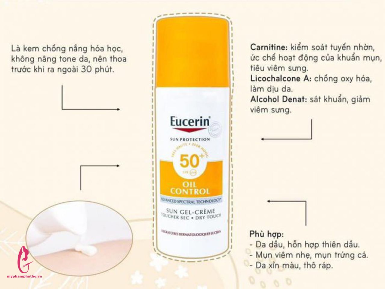 - Một số người có làn da nhờn và dễ bị mụn trứng cá thường lo ngại rằng kem chống nắng sẽ làm trầm trọng thêm những triệu chứng của họ và tránh hoàn toàn việc chống nắng. Kem chống nắng Eucerin Sun Gel Cream Oil Control SPF 50+ chuyên biệt dành cho tình trạng da nhờn và mụn trứng cá. Với kết cấu siêu nhẹ có công nghệ kiểm soát dầu nhờn L-Carnitine, sản phẩm sẽ tạo một lớp phủ khô và có hiệu quả chống nắng lên đến 8 giờ mà không gây nhờn rít trên da.