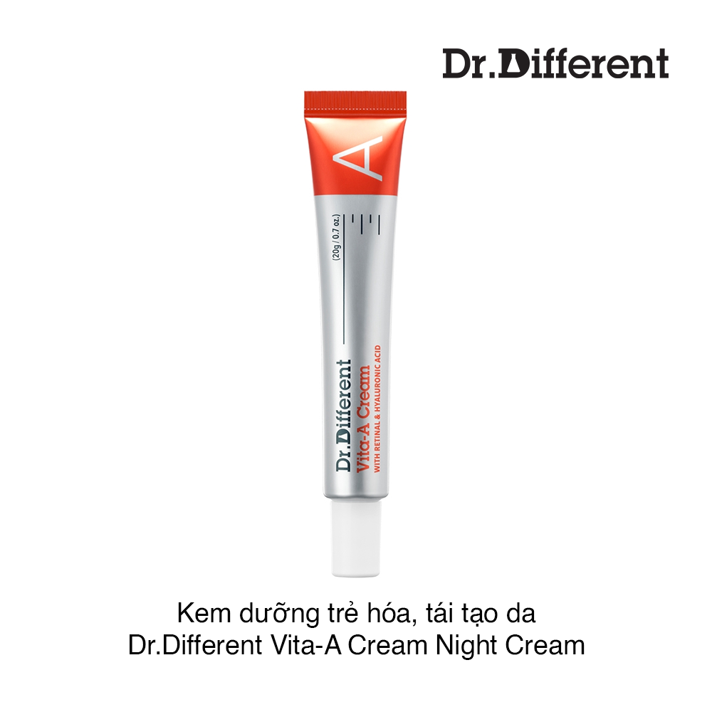 Kem Dưỡng Tái Tạo Và Làm Trẻ Hoá Da Dr Different Vita-A Cream Night Cream Retinal là sản phẩm kem dưỡng đêm chứa Retinal kết hợp cùng Hyaluronic Acid với công nghệ mới nhất, giúp củng cố màng bảo vệ da, ngăn ngừa và làm mờ nếp nhăn, cải thiện làn da không đều màu, thu nhỏ lỗ chân lông, cân bằng độ ẩm và độ pH tự nhiên của da, làm dịu và làm giảm thiểu kích ứng, nuôi dưỡng và phục hồi làn da từ sâu bên trong, thúc đẩy chu trình sừng hóa tự nhiên, chống lão hóa da đỉnh cao, phục hồi sinh khí, thúc đẩy tuần hoàn máu dưới da, tái tạo làn da căng bóng và khỏe mạnh.