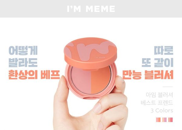 - Để giúp phái đẹp trông luôn luôn tươi tắn và xinh xắn thương hiệu I'm Meme đã cho ra mắt dòng sản phẩm phấn má hồng cùng với sự kết hợp của hai màu sắc thời thượng trong cùng một hộp phấn mang tên I'm Meme I'm Blusher Best Friend.