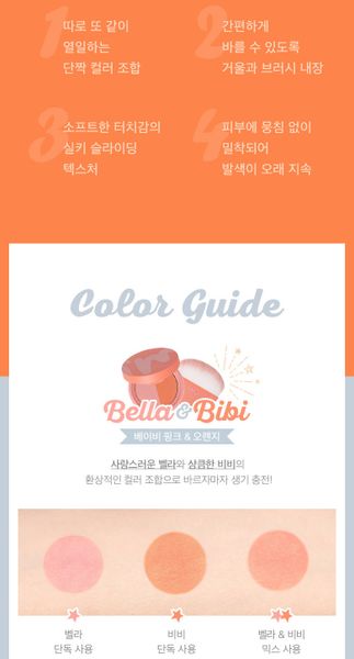 - I'm Meme I'm Blusher Best Friend sở hữu hai tone màu hồng baby và cam đây là sự kết hợp rất ngọt ngào và tươi tắn. Đối với màu hồng cam này sẽ làm gương mặt của bạn trông đầy đặn hơn và những bạn nào có sắc thái da hơi tái thì đây chính là màu sắc phù hợp cho các bạn. Màu hồng cam sẽ làm gương mặt của bạn trẻ trung, tự nhiên và mượt mà hơn rất nhiều. I'm Meme I'm Blusher Best Friend 001 Bella & Bibi mang sắc màu tươi tắn, tạo nét hồng xinh rạng ngời cho gương mặt của bạn khi trang điểm. Thậm chí, bạn sẽ không nhận ra là mình đang trang điểm vì lớp phấn rất tự nhiên và sẽ tệp vào da một cách nhanh chóng.