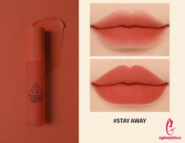 - Một trong những best - seller của dòng son Blurring Liquid Lip đến từ nhà 3CE đó chính là son 3CE Stay Away. Đỏ gạch quyến rũ, với chất son lì nhẹ tênh chẳng nàng nào có thể cưỡng lại được. Son phảng phất ánh cam nhưng chủ yếu vẫn là đỏ nên cô nàng nào có men răng không quá trắng cũng hoàn toàn có thể yên tâm sử dụng. Trong cả bộ sưu tập, son 3CE Stay Away xứng danh là siêu phẩm. Màu son nịnh da và phù hợp với đa phong cách. Chẳng cần makeup gì cũng có thể diện sắc son lên một cách hoàn hảo.