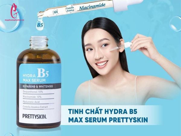 - Hydra B5 Max Serum Prettyskin là sự kết hợp hoàn hảo giữa axit Hyaluronic tự nhiên với khả năng dưỡng ẩm mạnh mẽ cùng niacinamide không chỉ giúp dưỡng ẩm da từ sâu bên trong mà còn giúp làm mờ nếp nhăn và làm trắng da và thành phần Pro-Vitamin B5 (10%) giúp làm cho làn da bị tổn thương và sần sùi trở nên mềm mại hơn.
