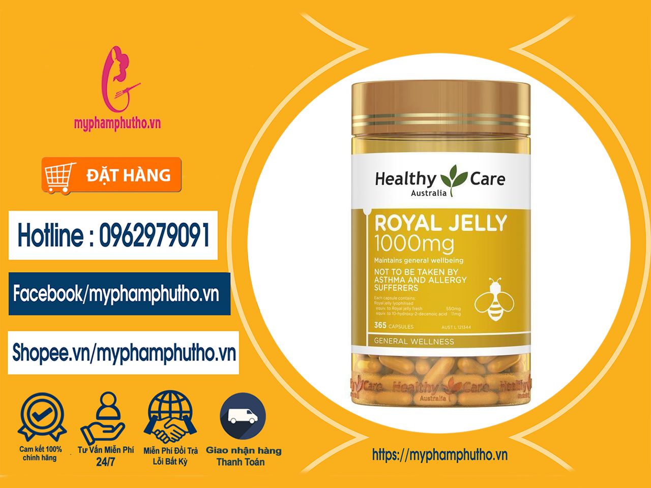 - Các bạn có thể truy cập trang trực tiếp vào Website : myphamphutho.vn gọi tới số Hotline : 0962979091 hoặc tới trực tiếp cửa hàng tại Địa chỉ : 1415 - Đại Lộ Hùng Vương - Tiên Cát -Việt Trì ' Phú Thọ để mua được sản phẩm viên uống sữa ong chúa Healthy Care Royal Jelly 1000mg chính hãng cùng nhiều các sản phẩm hỗ trợ làm đẹp và chăm sóc sức khỏe khác nhé.